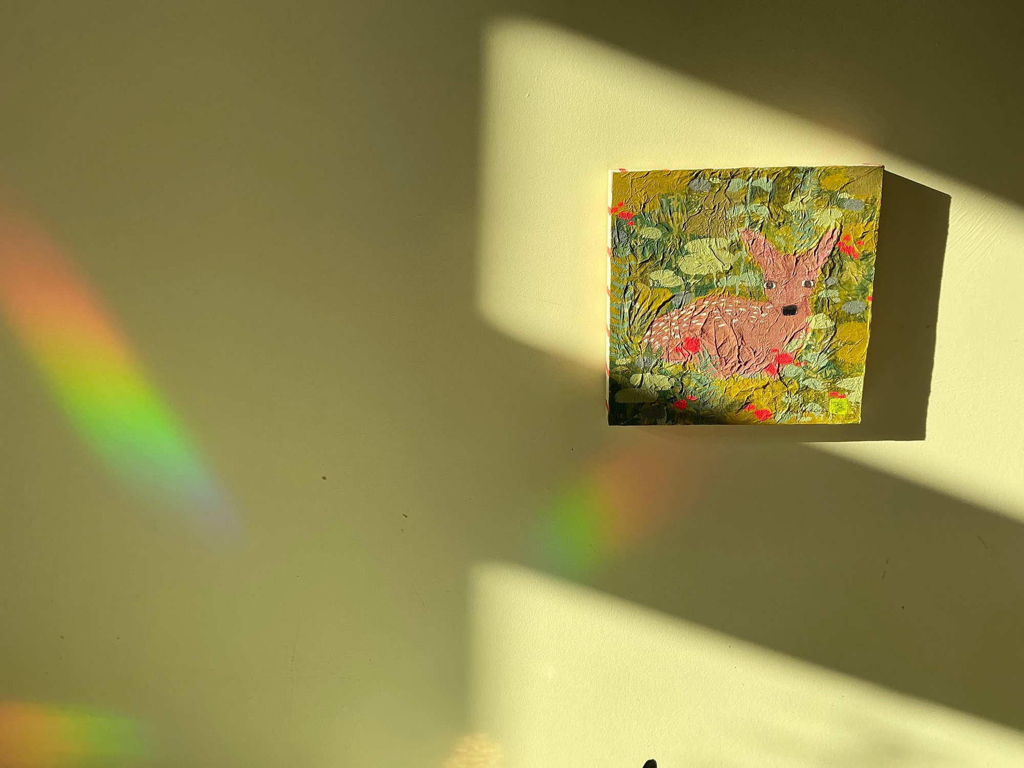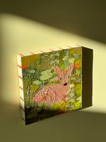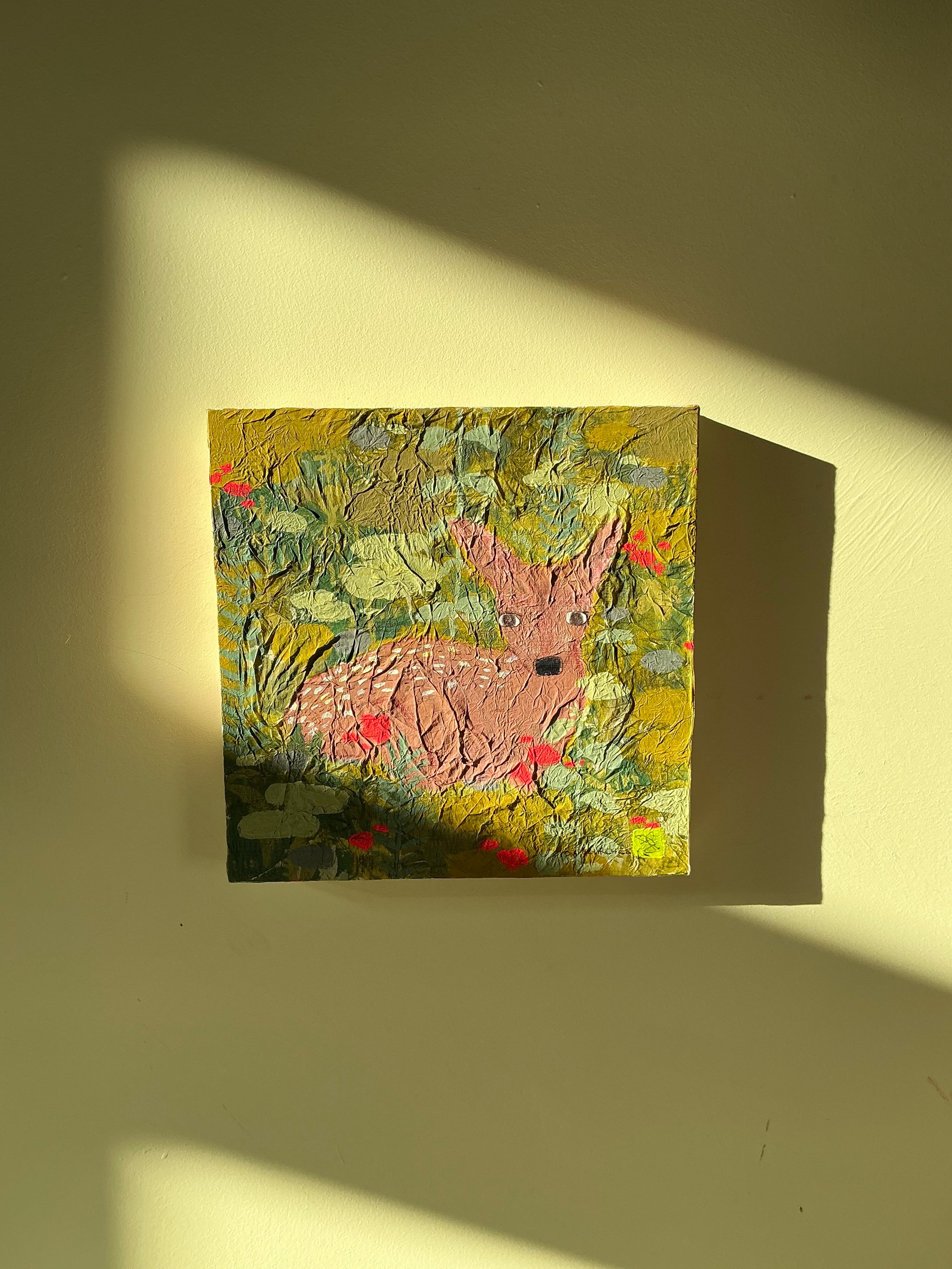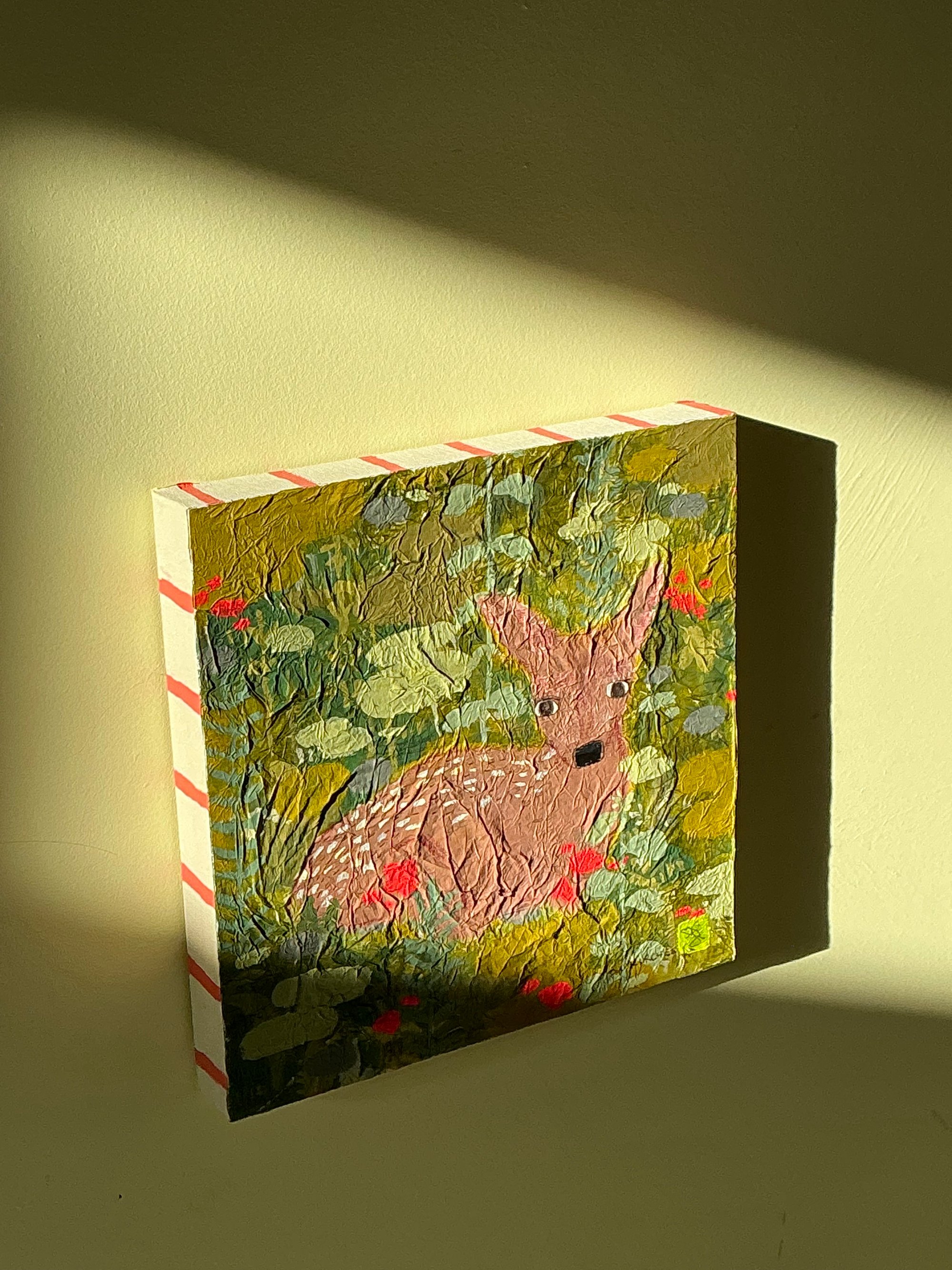 A little baby deer too scared to move, watching you from a field of red and green. A mixed media painting on a 15 x 15 wooden board with a layer of tissue paper. Comes signed by the artist Ida Kircher.