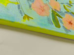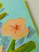 Peach nasturtium on a pale blue background with pops of neon yellow with orange and clear beads. Done on an A4 canvas with acrylic paint, coloured pencils and oil pastels.