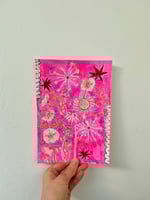 An A5 original drawing of abstract flowers on a fluorescent pink background. This artwork is signed and dated by the artist Ida Kircher.