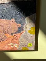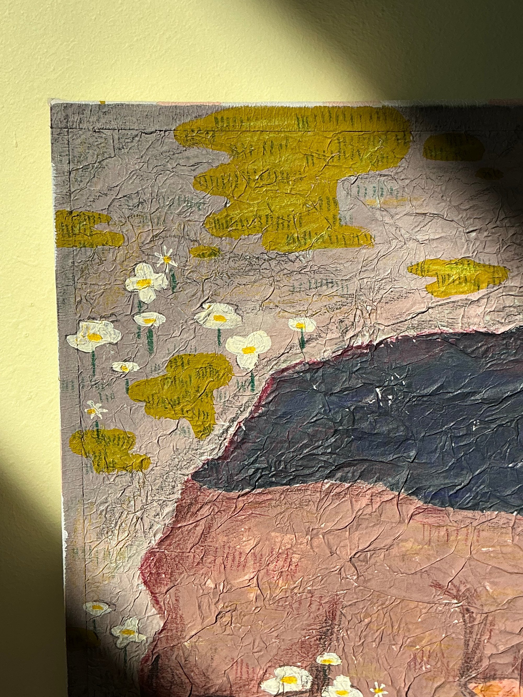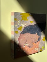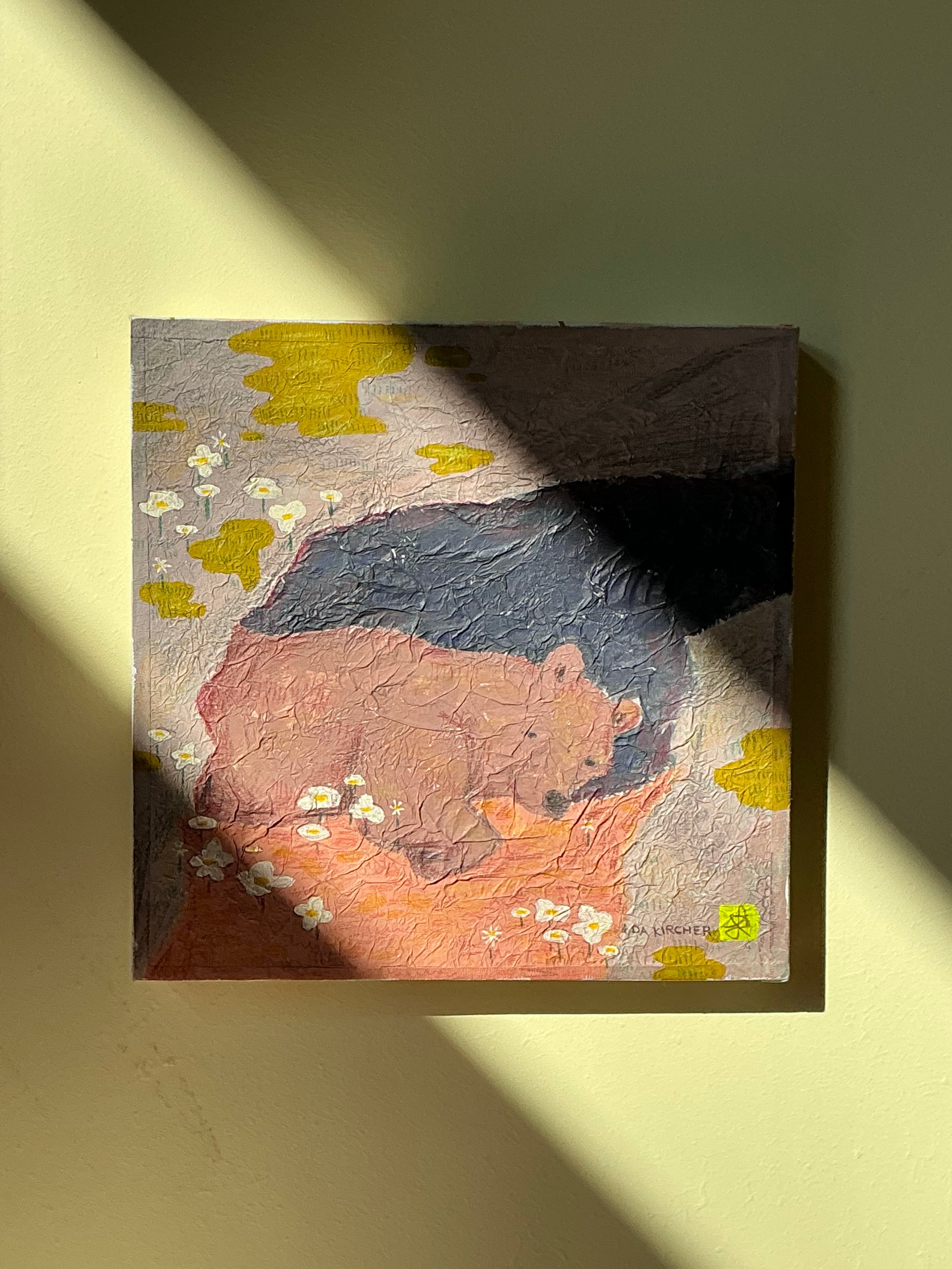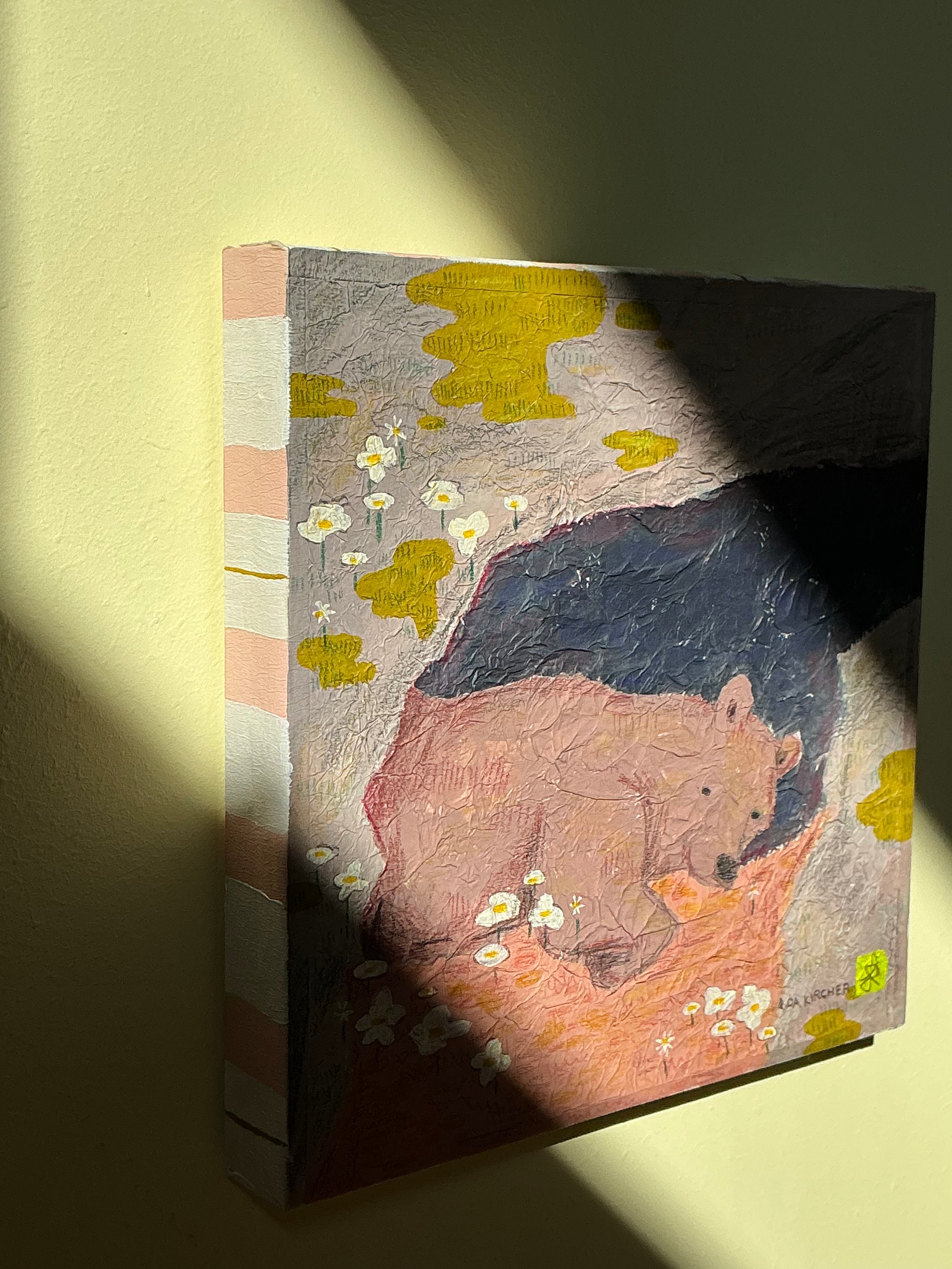 A sleepy bear waking up to find little white flowers and the sun on his face. He now knows that it’s spring. A 15 x 15 cm painting on a wooden board and tissue paper. Made using mixed media and is signed by artist Ida Kircher