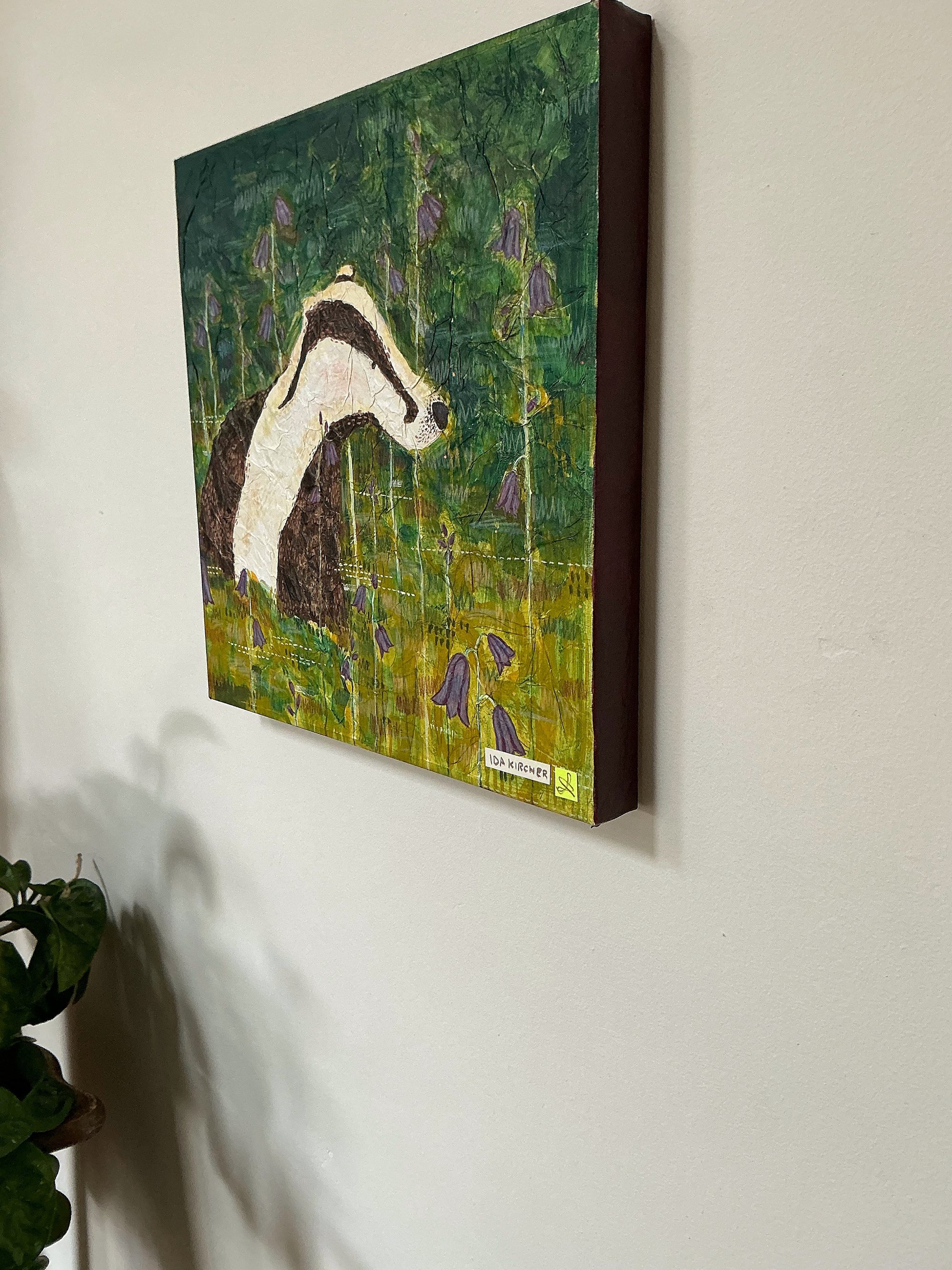 Just a badger passing as you are on your daily walk in the woods surrounded by a carpet of Spanish blue bells. A original mixed media painting on a 30 x 30 cm wooden board, ready to hang on your wall, and signed by the artist Ida Kircher.